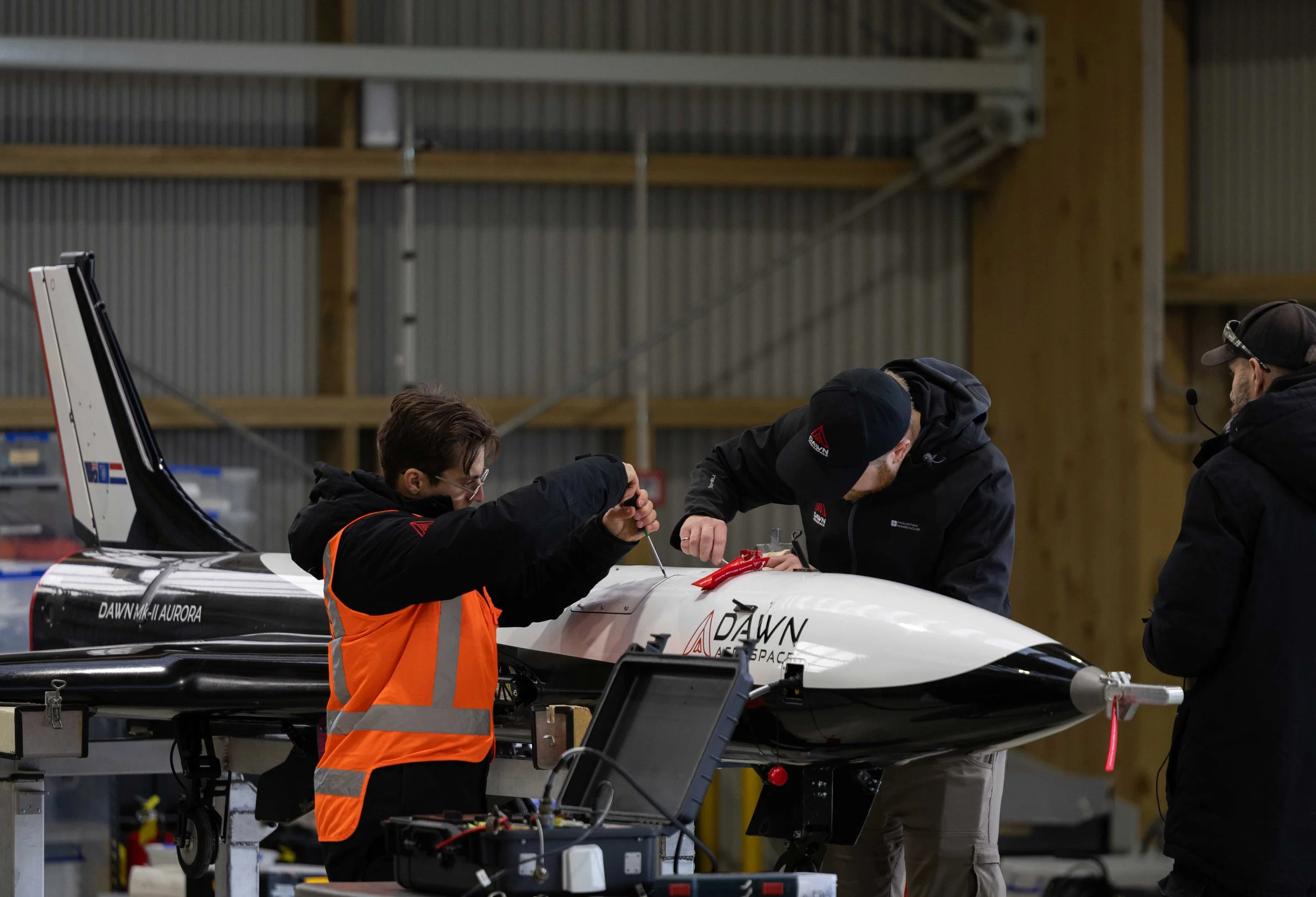 Final seal of the payload bay on Dawn Aerospace’s Aurora spaceplane, carrying Cal Poly’s payload, Tāwhaki’s hangar. Photo credit: Dawn Aerospace.