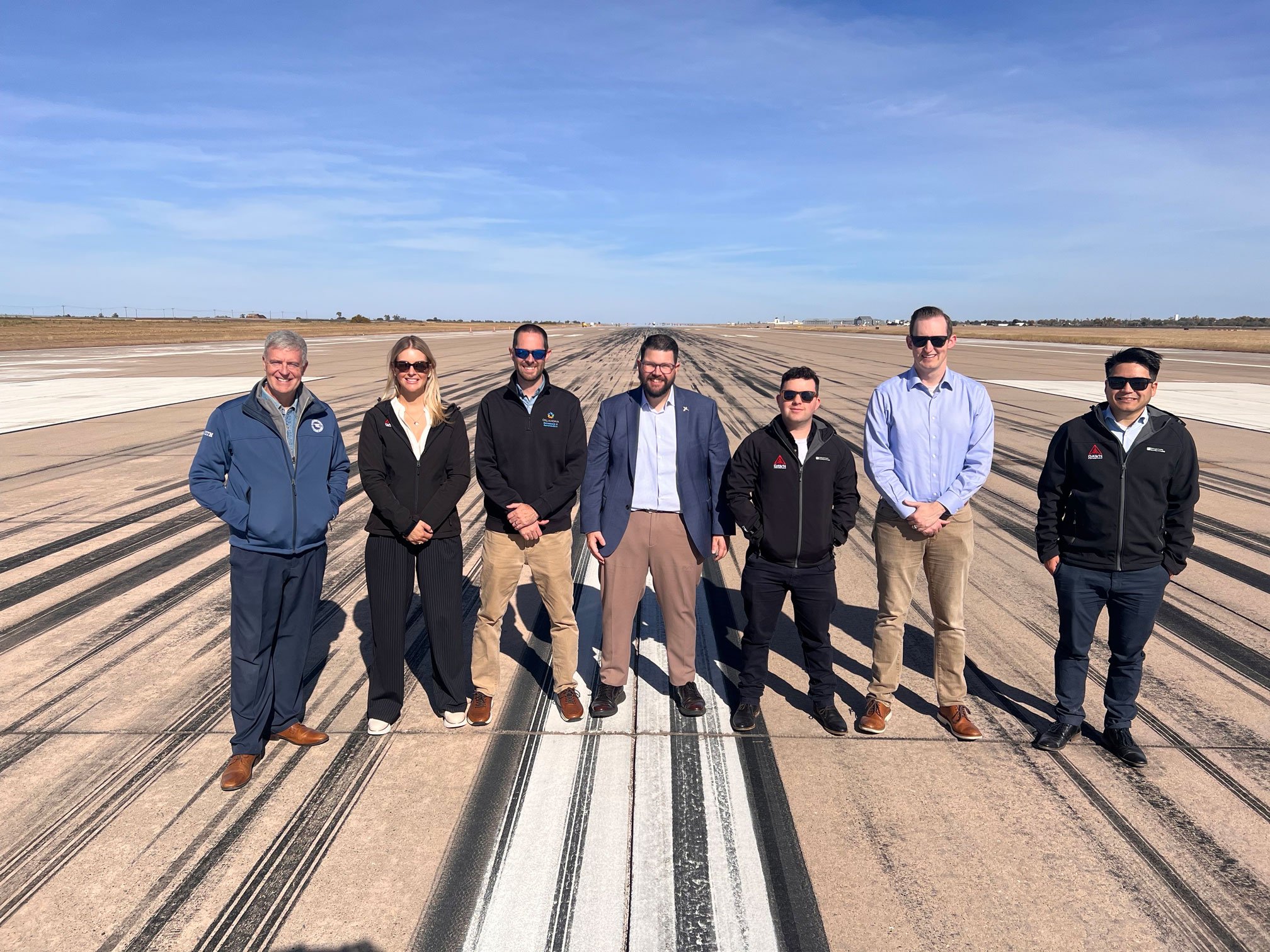 Dawn Aerospace, OSIDA, and ODAA representatives on the runway at Burns Flat during a site visit focused on assessing facilities, operational needs, and planned infrastructure upgrades for future spaceplane activity.